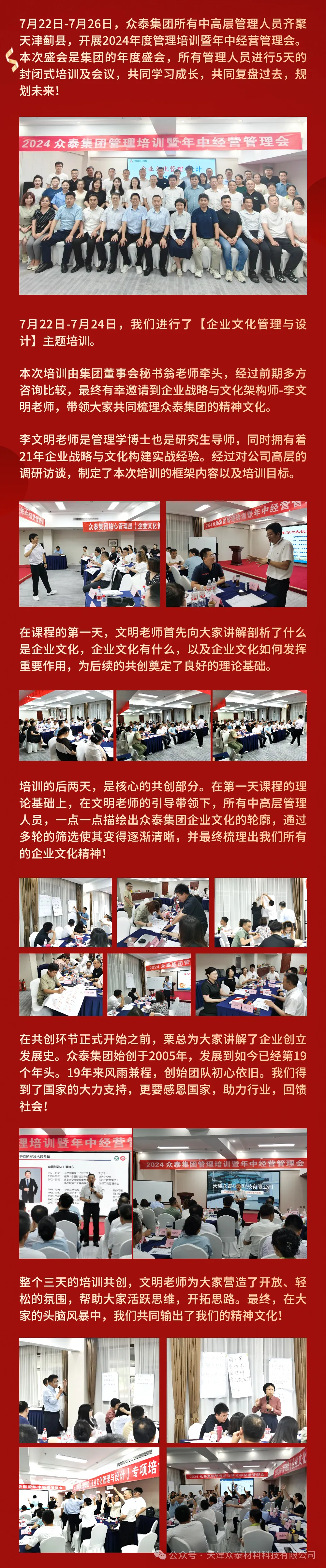 7月22日-7月26日,眾泰集團(tuán)所有中高層管理人員齊聚天津薊縣,開(kāi)展2024年度管理培訓(xùn)暨年中經(jīng)營(yíng)管理會(huì)。本次盛會(huì)是集團(tuán)的年度盛會(huì),所有管理人員進(jìn)行5天的封閉式培訓(xùn)及會(huì)議,共同學(xué)習(xí)成長(zhǎng),共同復(fù)盤(pán)過(guò)去,規(guī)劃未來(lái)!